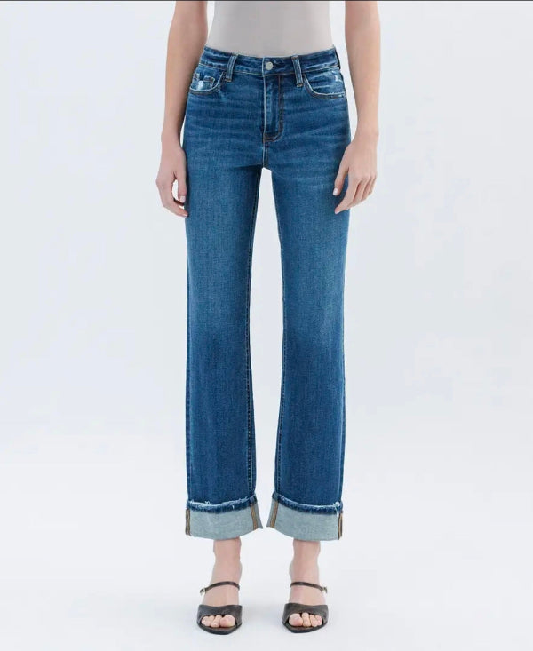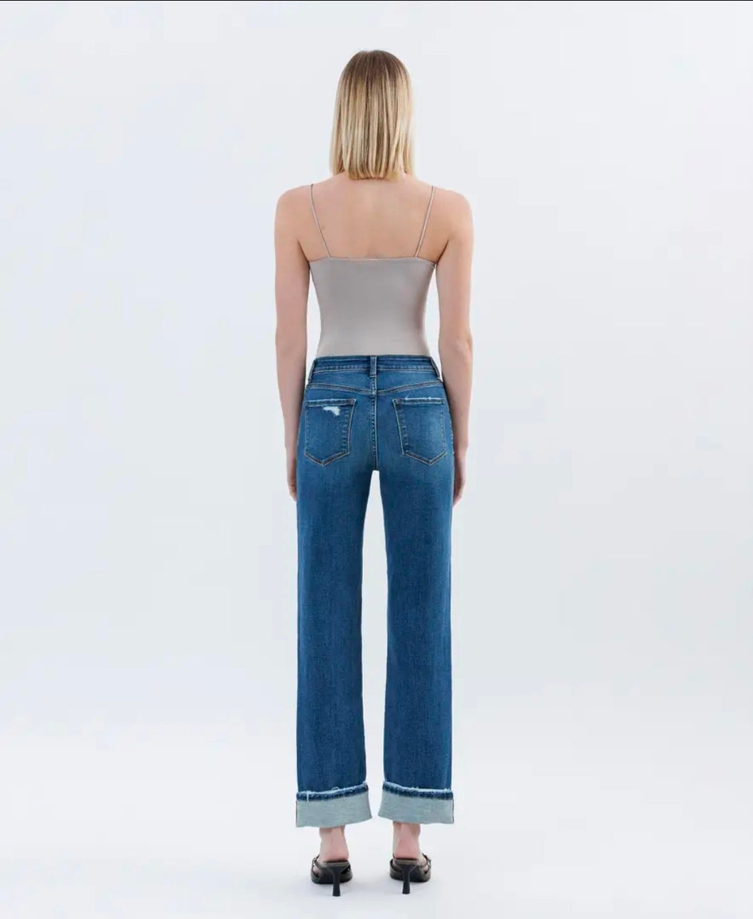 High rise cuffed straight jeans Comfort stretch denim, high rise waist, slightly distressed detail, single cuff hem, ankle length, straight jeans F. Rise: 10 1/2" / inseam: 28" / leg opening: 16 1/2" / cuff: 3" x 1