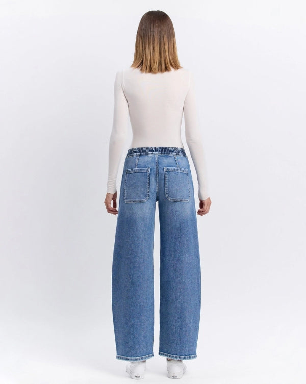 High rise elastic waistband wide barrel jeans Comfort stretch denim, high rise waist, elastic waistband, cropped length, wide barrel jeans