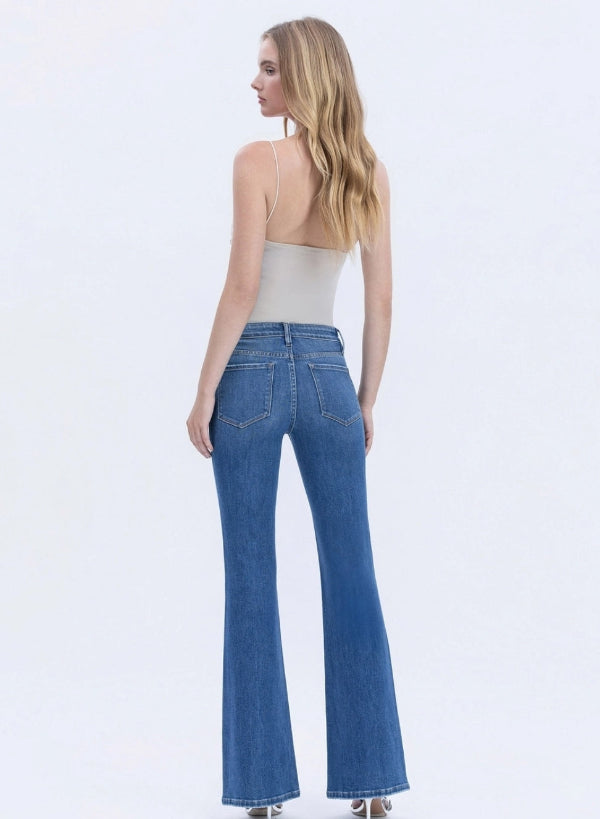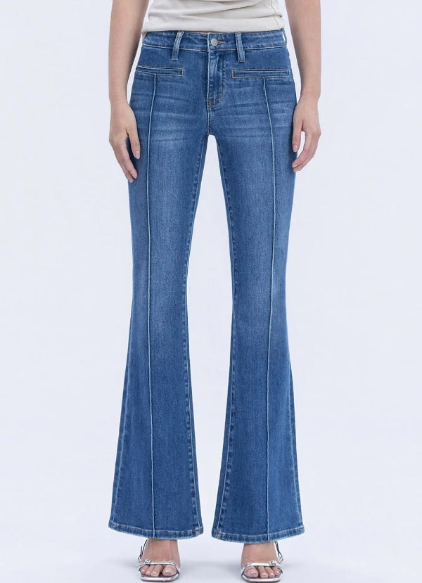MID RISE WELT POCKET PIN TUCK FLARE JEANS