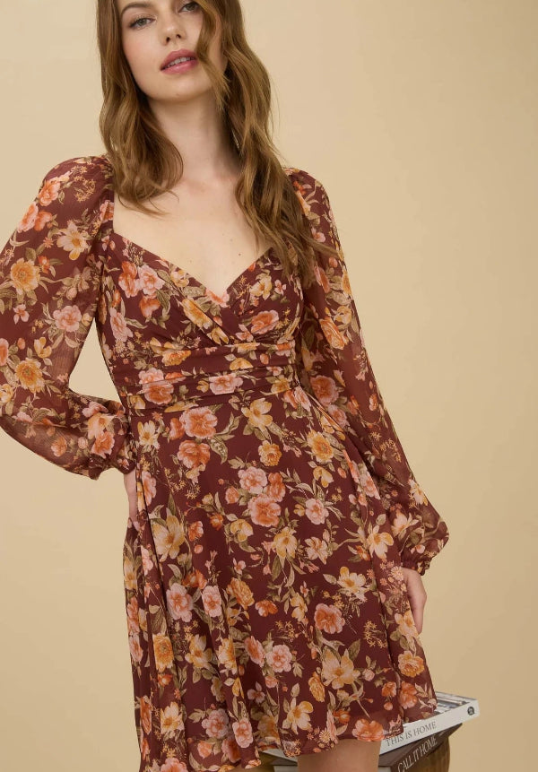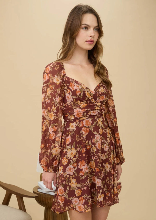 SWEETHEART NECKLINE LONG SLEEVES BACK SMOCKING WRAP WAIST DETAIL BACK TIE LINED FLORAL PATTERN MINI DRESS SHELL:100%POLYESTER LINING:100%POLYESTER