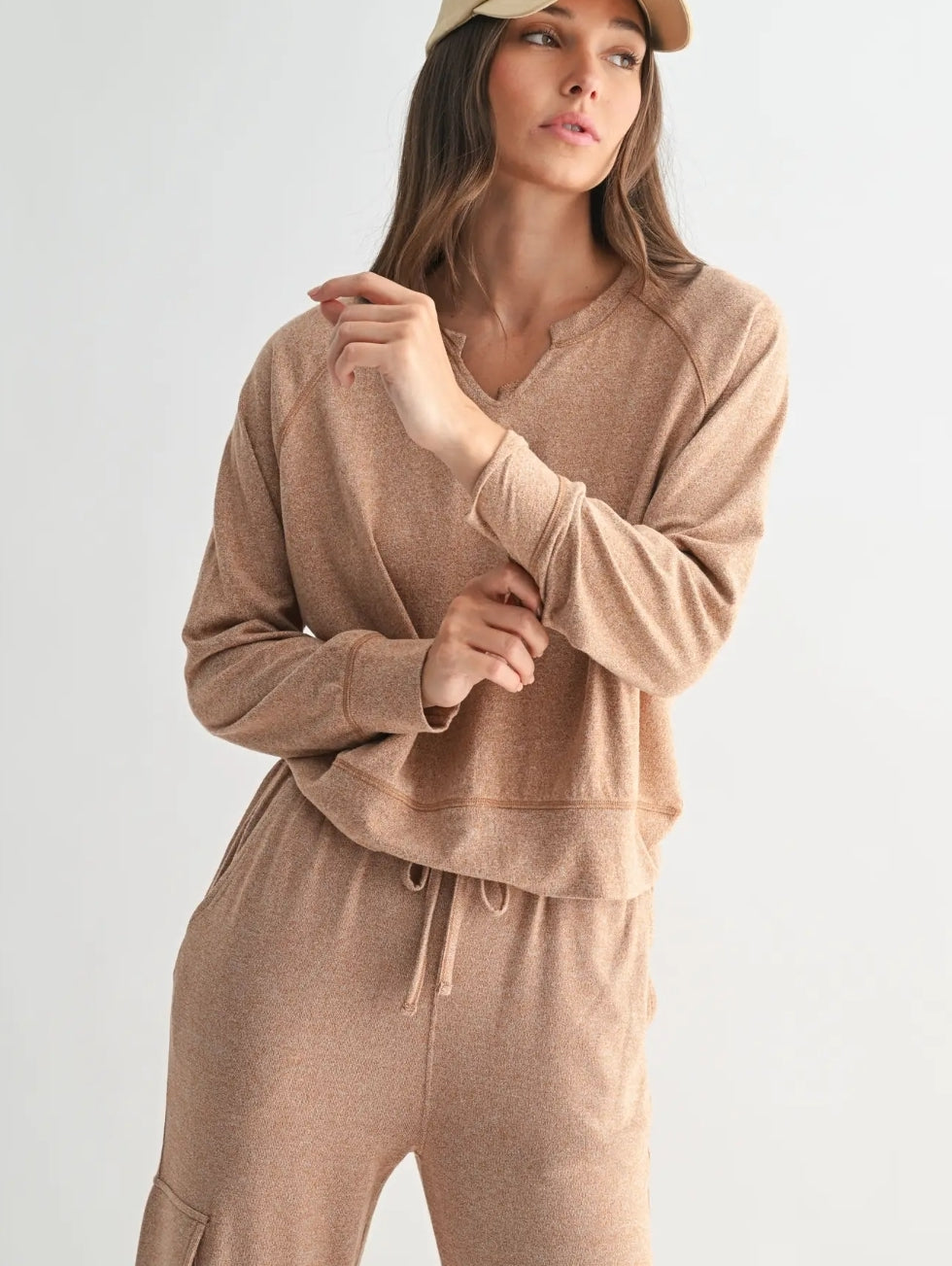 Crafted from our best-selling brushed Hacci fabric that feels as light and airy as a cloud, this Henley-style long sleeve is the perfect blend of comfort and casual charm. Designed with a slight V-neckline, it’s soft, breathable, and effortlessly easy to wear—whether you're lounging or on the go.