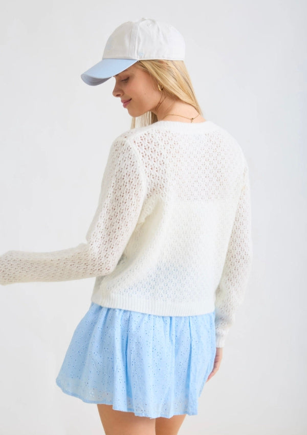 Round neckline Eyelet knit pattern Sheer knit Solid Not lined Knit cardigan sweater 77%acrylic 20%nylon 3%spandex