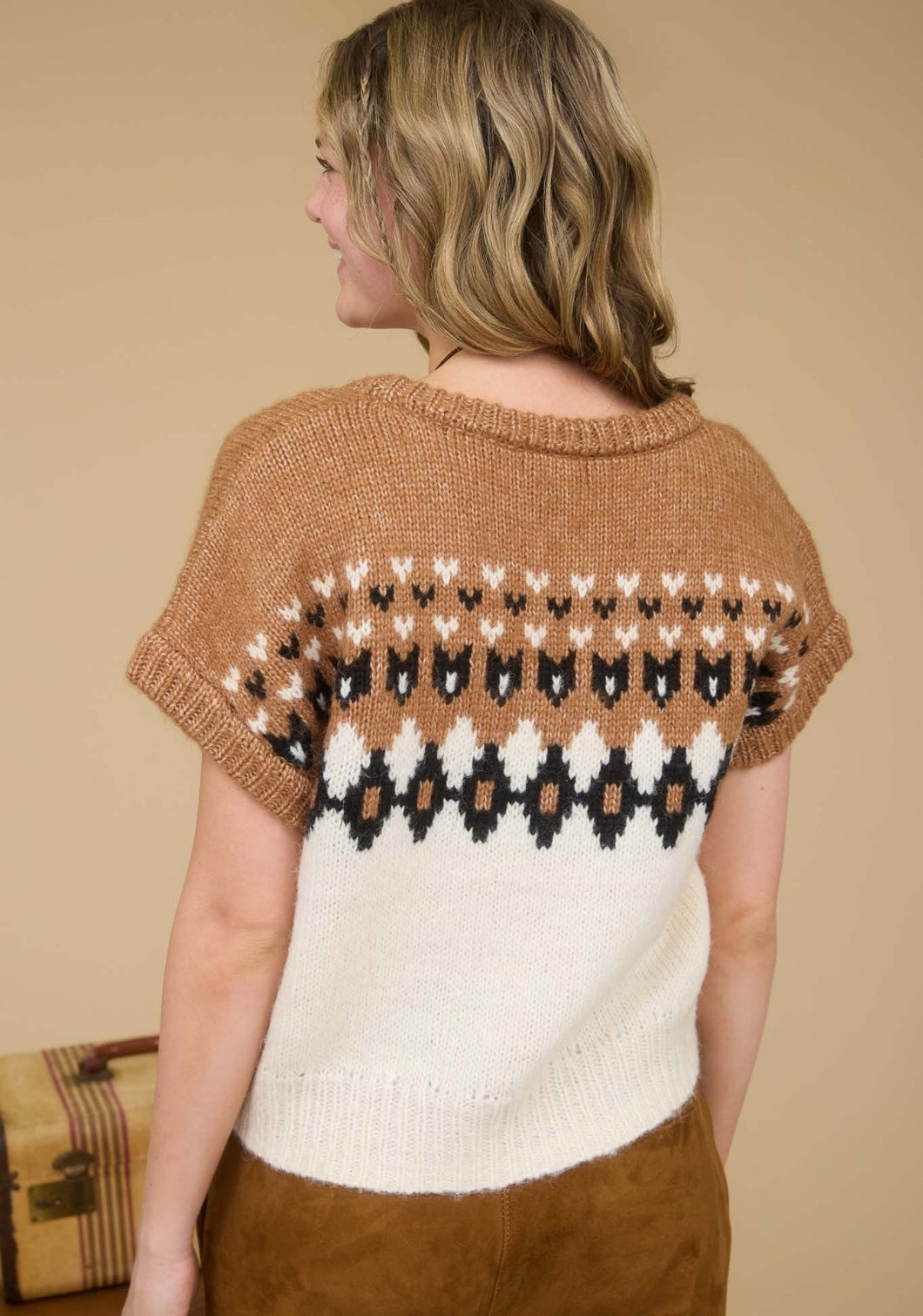 V NECKLINE SHORT SLEEVES DROP SHOULDER RIBBED TRIM FAIR ISLE MULTICOLOR PATTERN KNIT PULLOVER SWEATER WOOL BLEND 42% ACRYLIC 29% NYLON 21% POLYESTER 8% WOOL