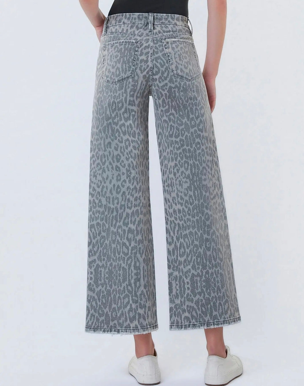 High rise grey leopard print crop wide leg jeans Comfort stretch denim, high rise waist, 5 pockets, finished hem, cropped length, grey leopard print, wide leg jeans F. Rise: 10 1/2" / inseam: 27" / leg opening: 21"