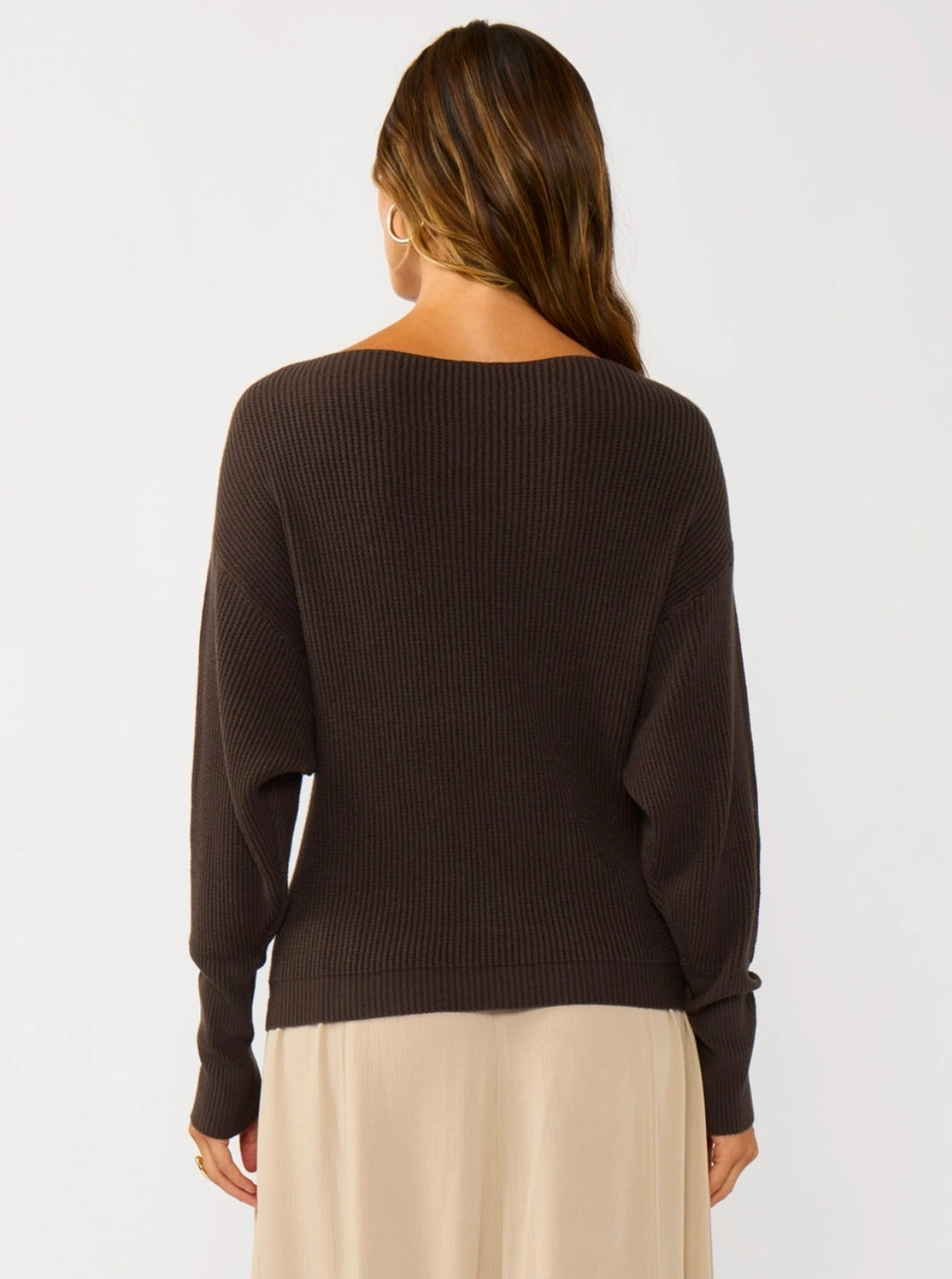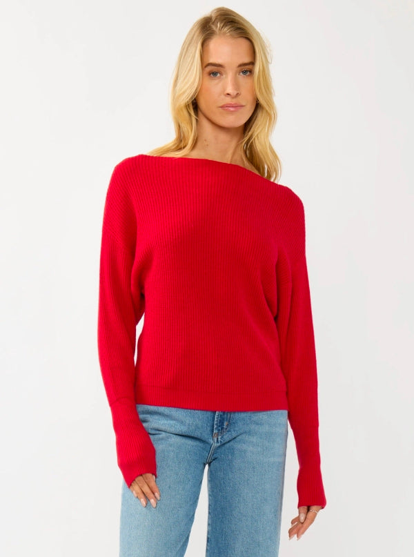 A cozy waffle knit pullover with a slouchy boat neckline and tapered Dolman sleeves. The perfect Fall sweater to pair with denim.