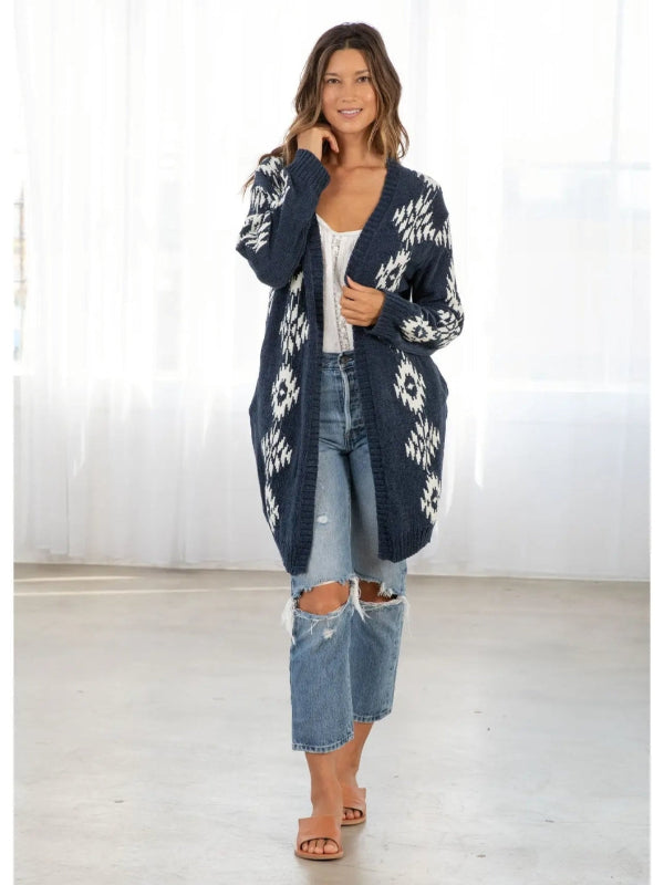 A beautiful western cardigan featuring a chic Southwestern pattern, two hidden side pockets, and ribbed trim, hem, and cuff detail. Fits below the waist with an oversized fit for an ultra cozy look.